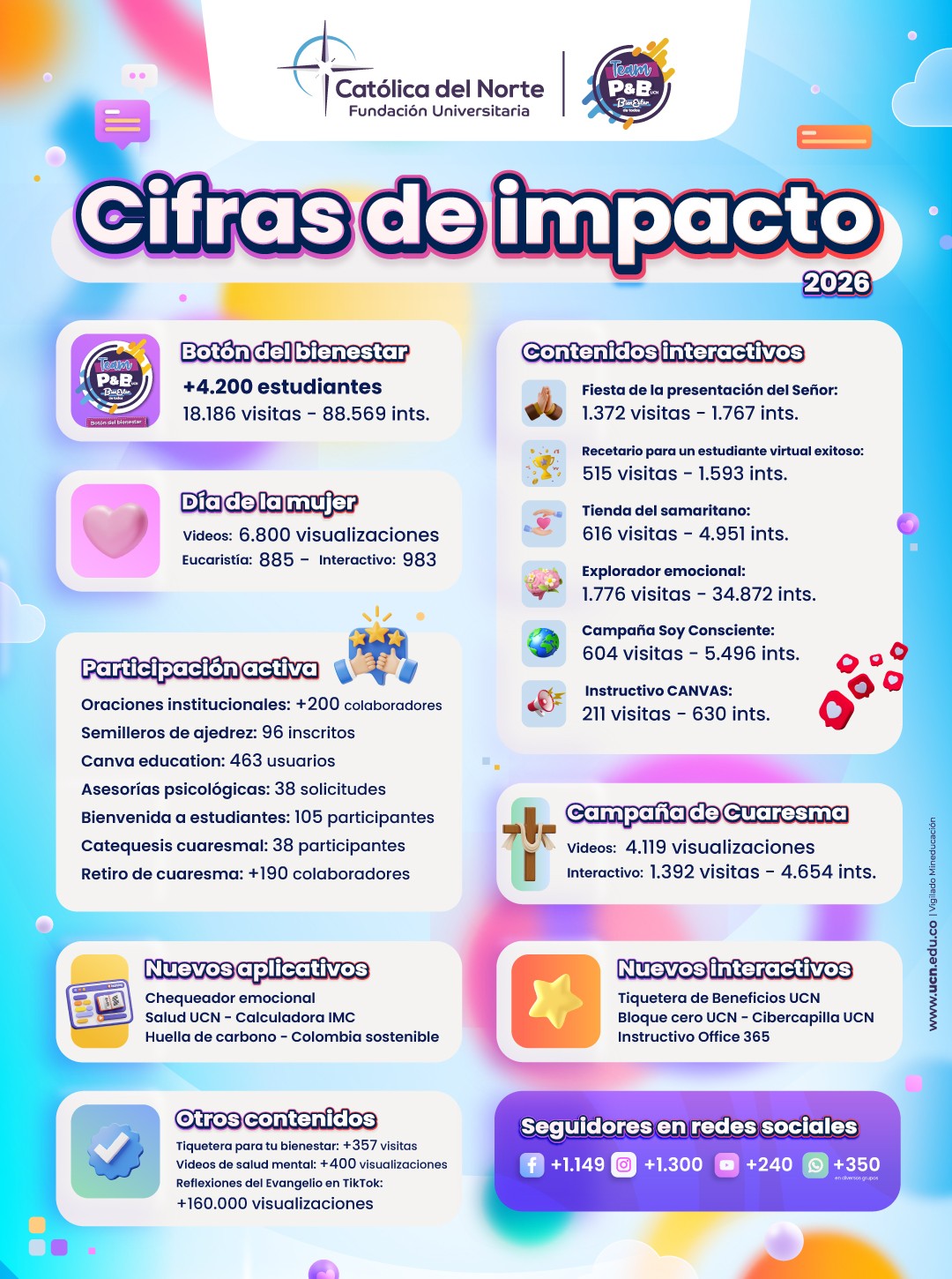 Más allá de los números, estos resultados evidencian una presencia cercana y significativa que responde a las necesidades de estudiantes, graduados y colaboradores, reafirmando el compromiso de Pastoral y Bienestar con la formación integral, el cuidado de la vida y la construcción de una comunidad más humana, solidaria y trascendente.
