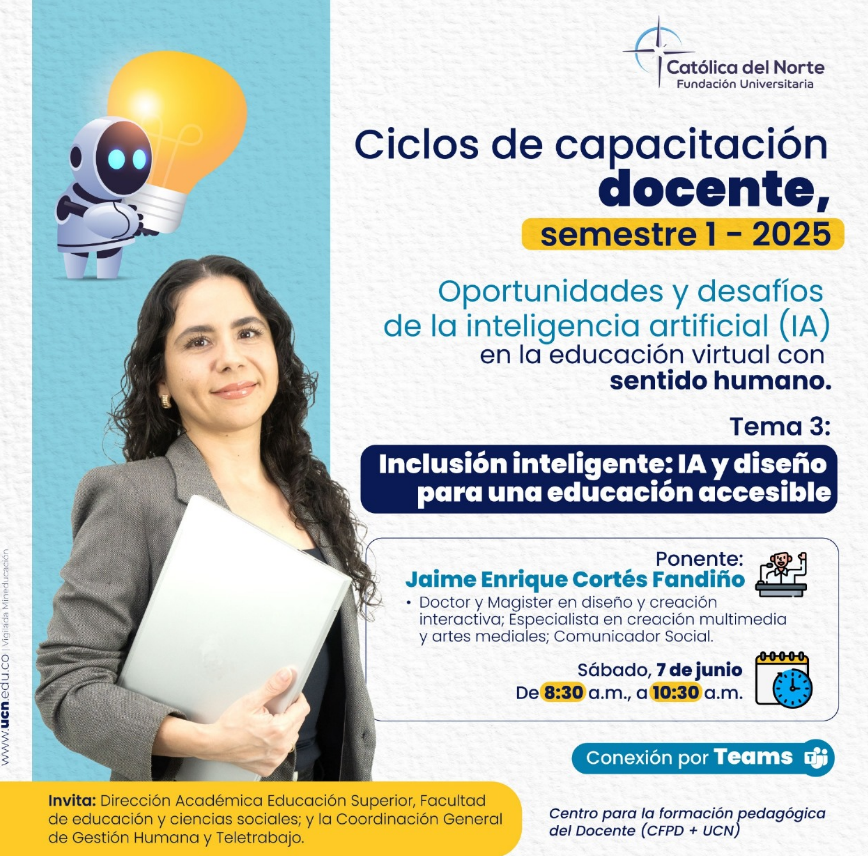 Ciclo de capacitación docenteEl estamento docente de educación superior de nuestra Católica del Norte continúa los ciclos de capacitación 2025 planeados de forma articulada por la Dirección Académica y la Coordinación de Gestión Humana y Teletrabajo. En este mes de junio finalizó el segundo Ciclo sobre Inclusión educativa e IA. Recordemos que este Plan se destaca por la transversalidad de la inteligencia artificial (IA) como valor añadido como herramienta y oportunidad claves de potenciar las prácticas pedagógicas en los ambientes virtuales de aprendizaje que acompañan nuestros docentes. Con la finalización exitosa de este segundo Ciclo, se cierra también la agenda de capacitación programada para el semestre 01 del presente año. En consecuencia, el plan de capacitación docente se retoma para el semestre 02 continuando con el método de ciclos. El tercer ciclo abordará el tema de investigación e IA el cual se planeará también con tres sesiones o encuentros a cargo de expertos externos a la Institución. Se recuerda que la serie de ciclos de capacitación docente suman para la certificación y actualización en competencias necesarias para la docencia en la educación virtual acorde con el modelo y enfoque pedagógico de la Cetólica del Norte. Esta certificación se expedirá siempre y cuando el/la docente apruebe los ciclos programados. Por lo anterior, los docentes llamados a la capacitación presentan, al cabo de cada ciclo, una evaluación que valora la comprensión de los temas desarrollados. Para finalizar, la orientación e invitación a todo el estamento docente de educación superior de nuestra Católica del Norte, por parte de la Dirección Académica y la Coordinación de Gestión Humana y Teletrabajo, es llevar a la práctica pedagógica o ejercicio de docencia virtual todas las comprensiones, aprendizajes y conocimientos que expertos y ciclos desarrollan. La razón esencial es potenciar y agregar valor a la calidad, excelencia académica e innovación del servicio educativo virtual con sentido humano. |