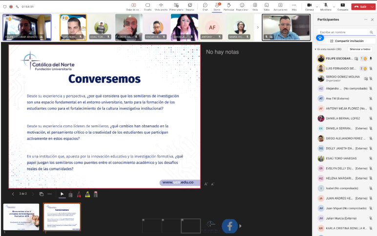 La investigación formativa se fortalece en la Fundación Universitaria Católica del NorteLa Coordinación de Investigaciones e Innovación de la Fundación Universitaria Católica del Norte celebró, el 20 de junio, las V Jornadas Internas de Investigación Formativa, que fue un espacio para reafirmar el compromiso institucional con el desarrollo de las competencias investigativas desde los estudiantes. El encuentro se consolidó como una oportunidad para que estudiantes de diversos programas pudieran presentar los avances y resultados de sus proyectos de investigación. En esta ocasión, se socializaron cinco iniciativas lideradas por semilleristas que abordaron temáticas como la educación en la primera infancia, la conciencia política en adolescentes, los retos de la salud mental desde una mirada sociocultural, el acompañamiento a conductas desafiantes en niños, y el impacto de los videojuegos en la vida social de los jóvenes. La jornada comenzó con un acto de instalación a cargo de las directivas de la Institución, seguido por un panel sobre experiencias significativas y metodologías de trabajo en los semilleros de investigación, en el cual participaron los lideres de los semilleros. Este espacio de diálogo permitió compartir buenas prácticas y motivar a nuevos estudiantes a integrarse a los procesos investigativos. Las V Jornadas fueron un escenario enriquecedor, tanto para los ponentes como para los asistentes, pues permitieron reconocer la investigación formativa como una herramienta clave para el fortalecimiento académico, el pensamiento crítico y la innovación. Además, contribuyen a consolidar los semilleros como comunidades de aprendizaje activas, dinámicas y articuladas a los retos del entorno. |