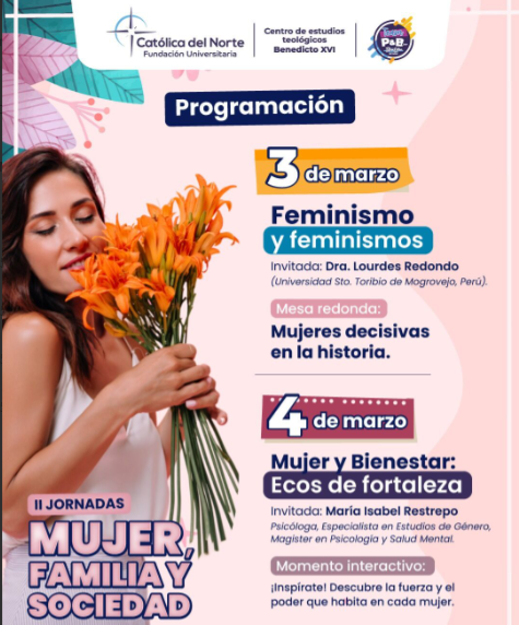 II Jornadas mujer, familia y sociedadEn el marco de la celebración del Día de la Mujer, la Facultad de Humanidades y Ciencias Eclesiásticas, desde su Centro de Estudios Teológicos Benedicto XVI y Pastoral y Bienestar de la UCN, llevaron a cabo estas II Jornadas los días 3 y 4 de marzo de 2025. Con el objetivo de reflexionar sobre el ser mujer, de subrayar la importancia de esta en la familia, y de destacar los rasgos femeninos que las mujeres han aportado a la sociedad colombiana, el día 3 se reflexionó sobre el feminismo con la ponencia Feminismo y feminismos, a cargo de la Dra. Lourdes Redondo, de la Universidad Santo Toribio de Mogrovejo, de Perú, en la cual destacó el verdadero feminismo. A continuación, tuvo lugar la mesa redonda: “Mujeres decisivas en la historia”, en la que se presentaron seis grandes mujeres que han dejado una huella profunda en la sociedad. Estas fueron las personas de la Institución que hablaron sobre ellas: