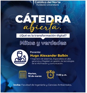 CÁTEDRA ABIERTA: ¿QUÉ ES LA TRANSFORMACIÓN DIGITAL? MITOS Y VERDADES.El 18 de marzo se ofreció esta cátedra abierta a cargo del docente Hugo Alexander Balbín Espinal, Ingeniero forestal, Magíster en bosques y conservación ambiental y líder del Grupo de Investigación: ingeniería, ciencias ambientales e innovación, de la facultad. La tecnología está permitiendo que se logren grandes avances en diferentes áreas, además las implementaciones cada vez más se hacen en menor tiempo. La transformación de los negocios y de la sociedad han hecho que para poder sobrevivir se deben adaptar a las nuevas realidades y eso nos lleva a preguntarnos: ¿la transformación digital es un mito o una realidad? |