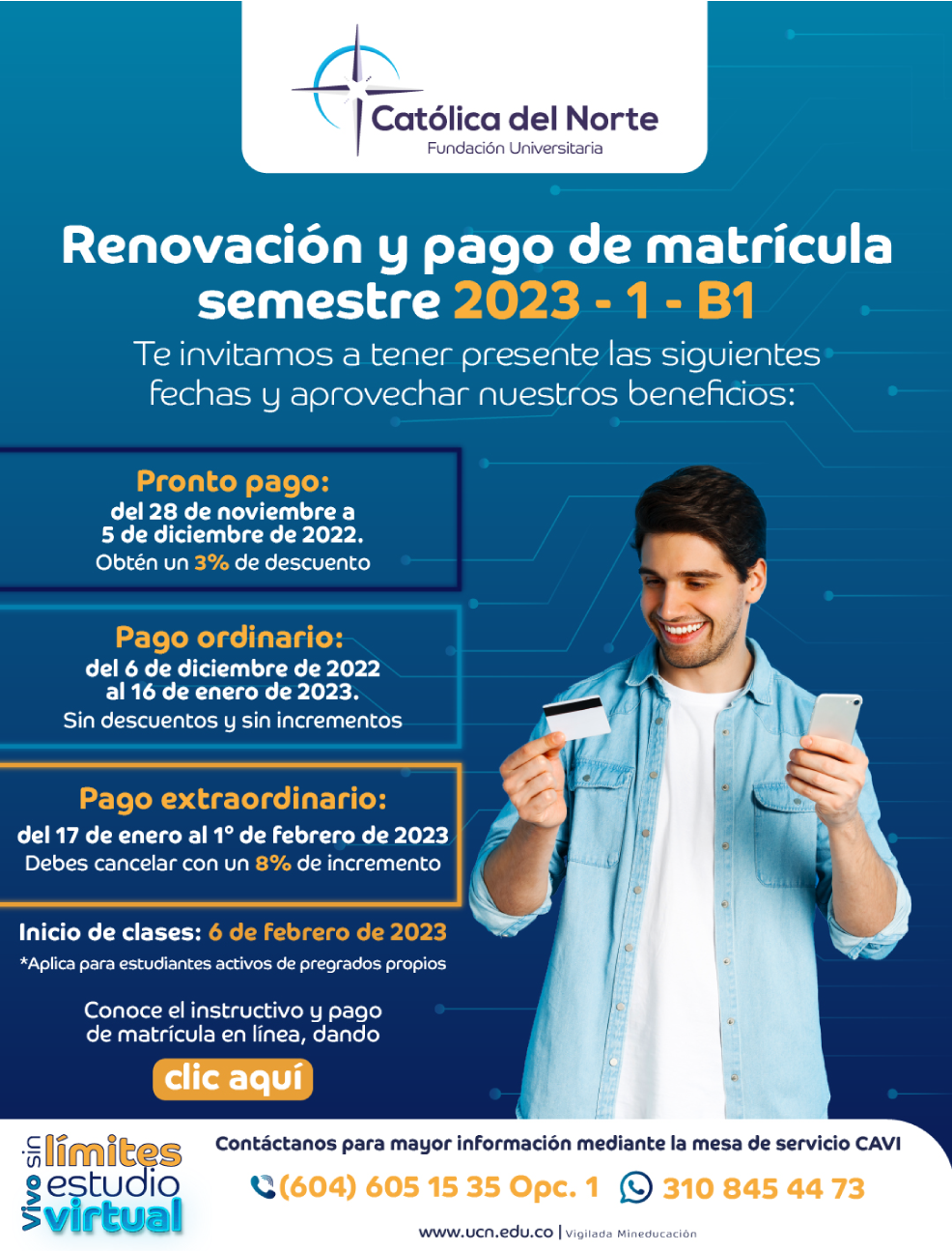La Fundación Universitaria Católica del Norte da apertura a la matrícula y adición de cursos para el bloque 2 del semestre 1 de 2023, por lo tanto, le invita a tener en cuenta la siguiente información: