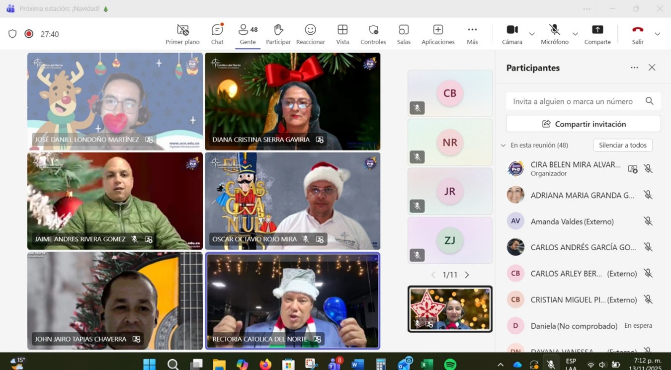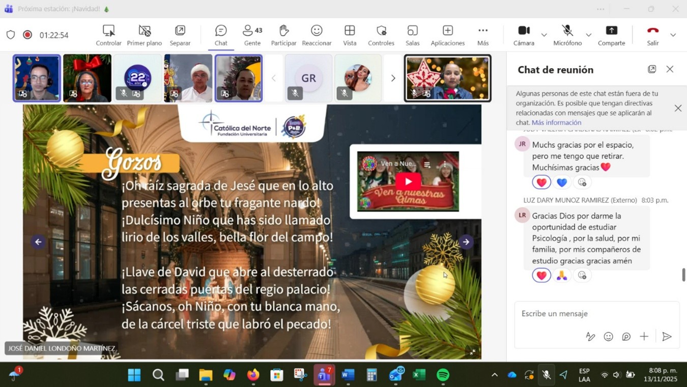 El pasado jueves 13 de noviembre se llevó a cabo el encuentro “Próxima Estación: Navidad”, un espacio institucional preparado para celebrar la llegada de esta temporada especial y acompañar a nuestros estudiantes en un cierre de año significativo. La actividad fue diseñada para propiciar un ambiente de serenidad, reflexión y participación, permitiendo que cada asistente se dispusiera con apertura a vivir la Navidad desde una mirada más consciente, celebrativa y comunitaria. La jornada se desarrolló como un recorrido simbólico por diferentes estaciones: la estación de la alegría, donde se recordaron canciones representativas de la época navideña y decembrina; la estación de la gratitud, destinada a despertar la conciencia agradecida por todo lo vivido durante el año; la estación de las tradiciones, que evocó costumbres, recuerdos y expresiones propias de este tiempo; la estación de la esperanza, orientada a proyectar el corazón hacia el gran regalo de la Navidad: Jesús; y finalmente, la estación de los aguinaldos, que permitió compartir algunos bonos con los participantes. Cada estación aportó un matiz particular que enriqueció la experiencia de los estudiantes y profundizó el sentido navideño del encuentro. Este recorrido permitió preparar el espíritu para la Navidad, motivando a los estudiantes a detenerse, agradecer, celebrar y proyectarse con confianza hacia lo que viene. Agradecemos la participación activa, respetuosa y comprometida de todos, quienes dieron vida y significado a este espacio pensado para cultivar la alegría, el sentido y la unión en nuestra comunidad educativa. Genially: https://view.genially.com/6913b07cba56936b624d5d8b Video del encuentro: https://youtu.be/SIKZUIl5-Nc |